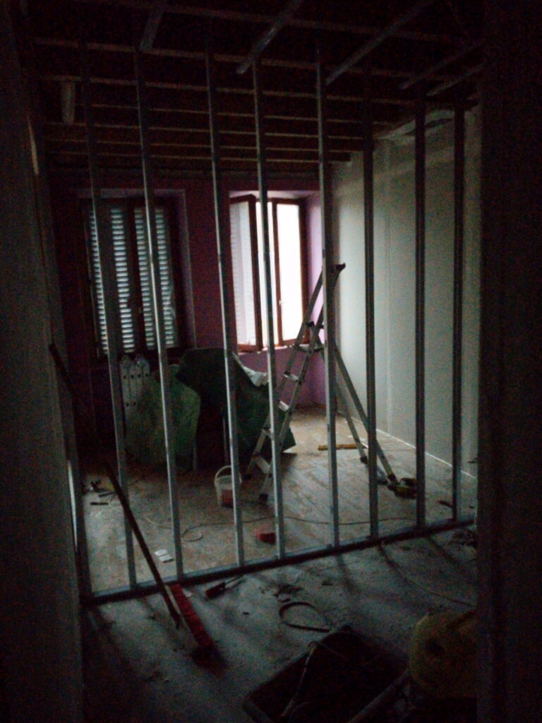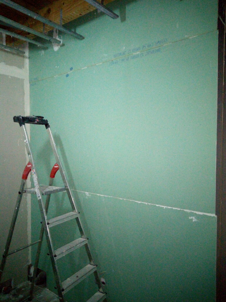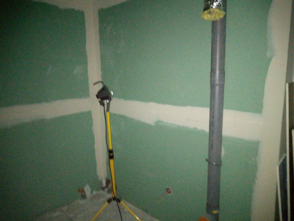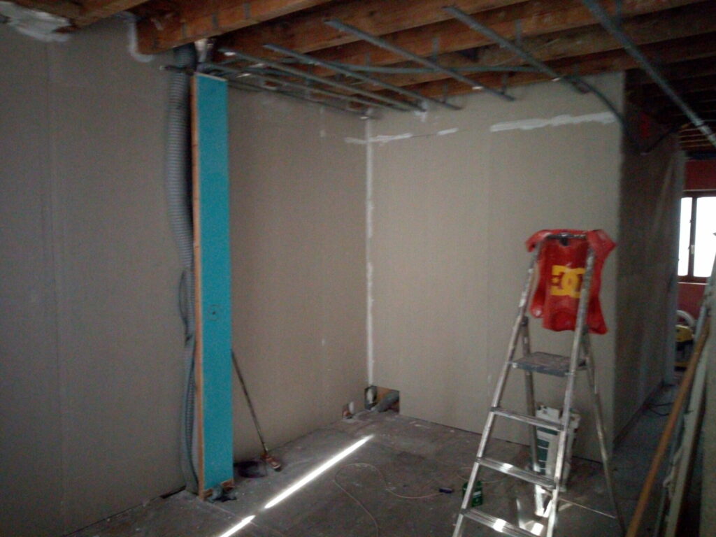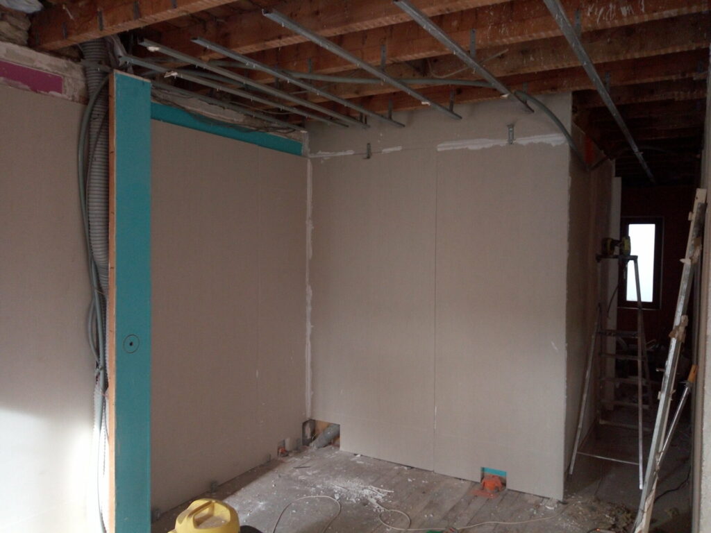 Comme pour le reste de l’appartement, les cloisons mitoyennes ont étés doublées avec des plaques de doublage puis recouverte perpendiculairement de placo marine.