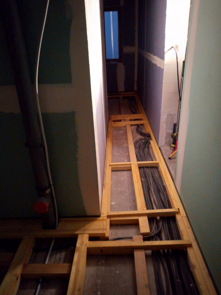 Les arrivées et évacuations du lavabo et de la machine à laver ont étés encastrés dans un caisson. Et j’ai aussi ajouté une structure en rail / placo pour recevoir le lave linge en bas et éventuellement un sèche linge au dessus si j’en ai un jour besoin …