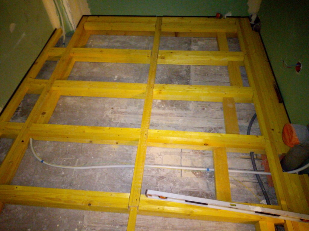 Encore une fois, le niveau du sol a du être relevé en appliquant la même méthode que pour le salon et le bureau : structure désolidarisée de l’existant en chevrons et liteaux perpendiculaires avec une pose perpendiculaire aux solives existantes.