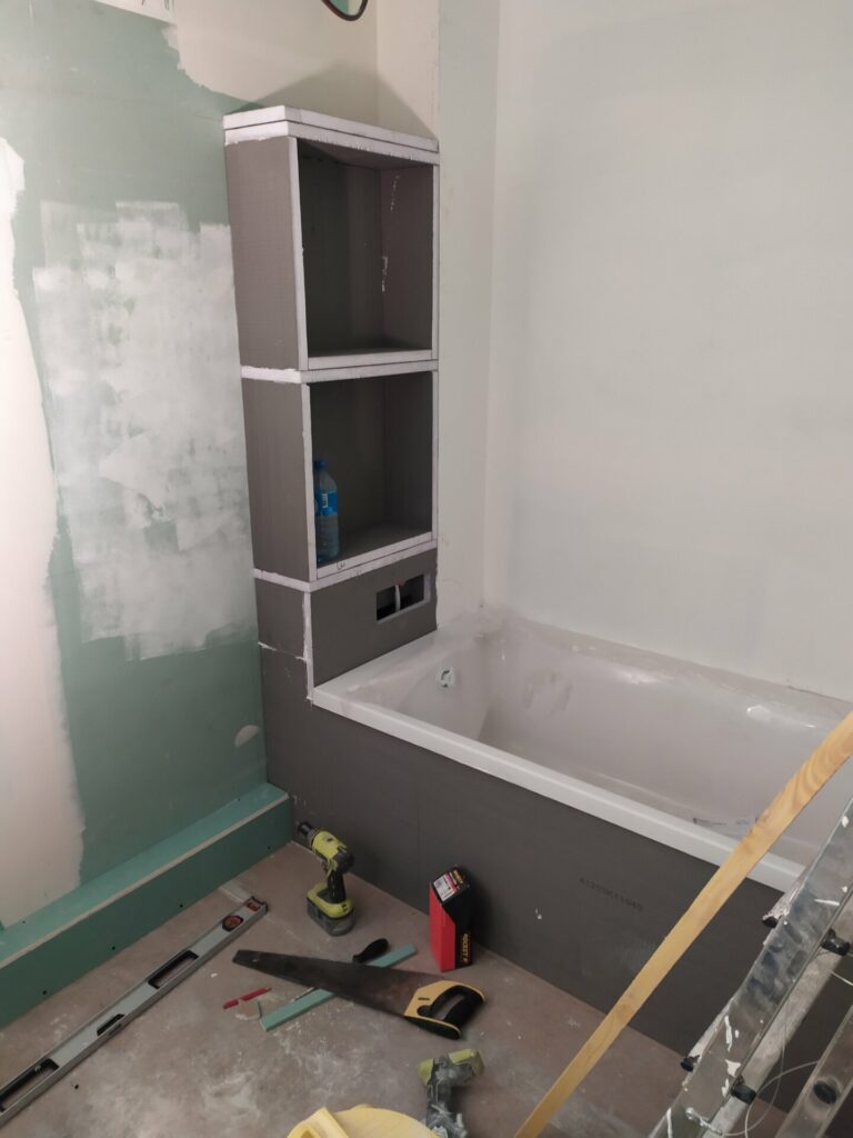Les murs autour de la baignoire ont reçu un traitement hydrofuge et les étagères et le tablier ont été fait avec du jackon / wedi (je ne sais plus ce qui était disponible sur le moment) et collés au Sika.