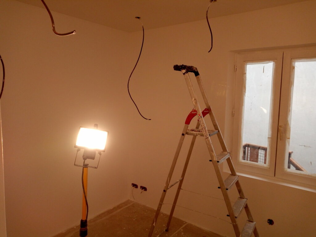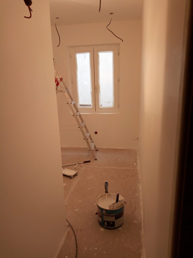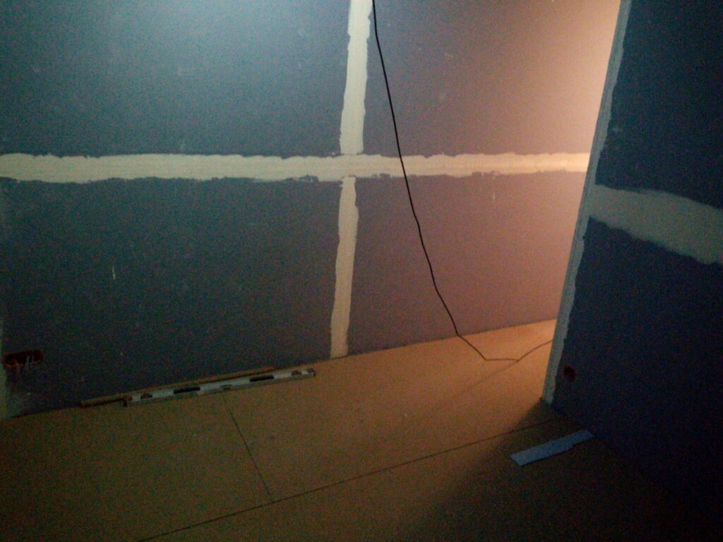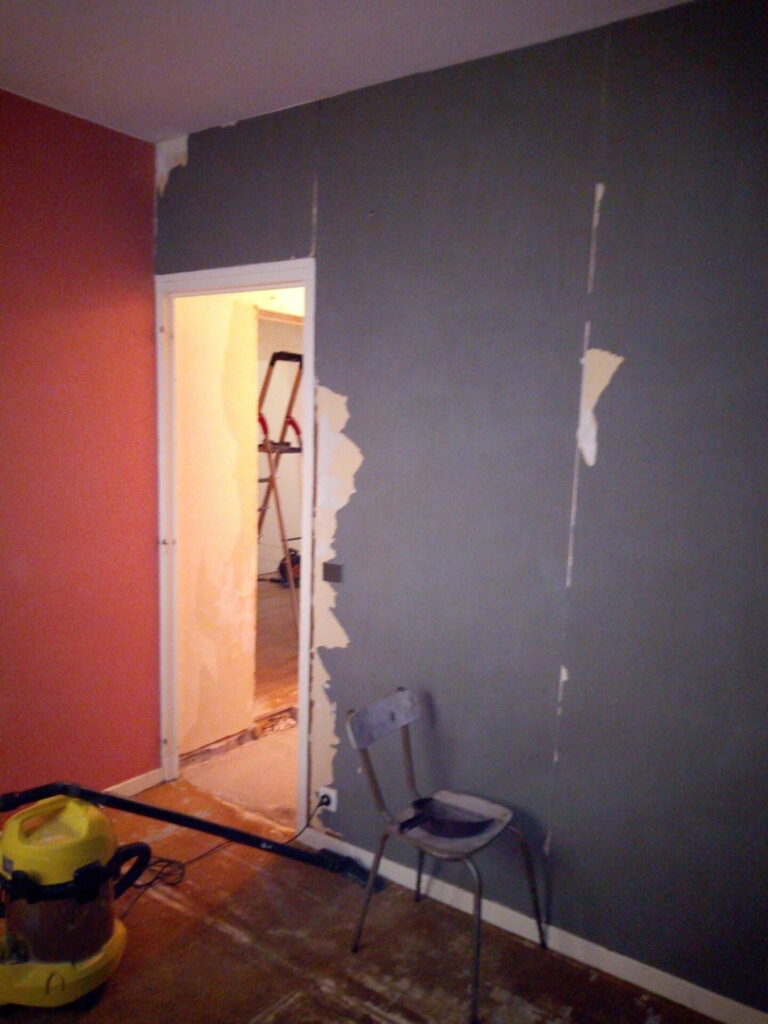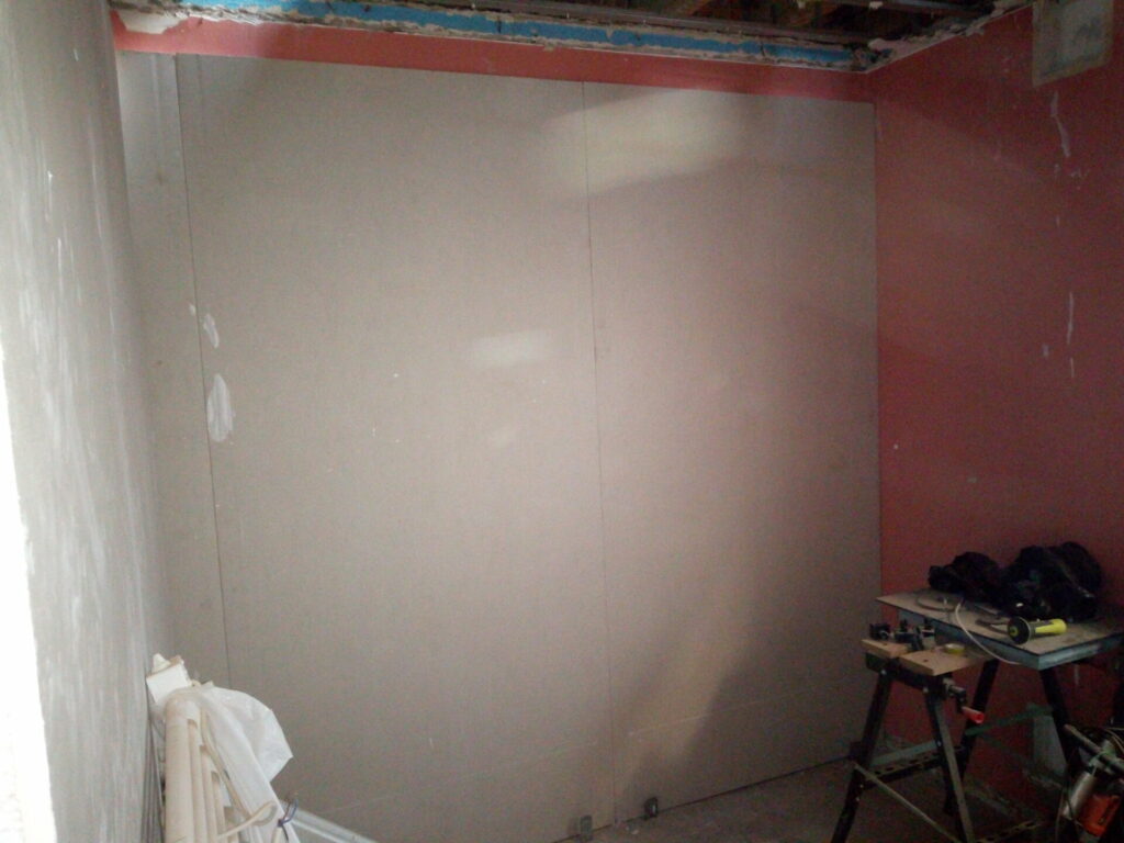 Deux cloisons étaient mitoyennes, elles sont désormais doublées avec des plaques de doublage et du placo phonique a été ajouté perpendiculairement à la première couche.