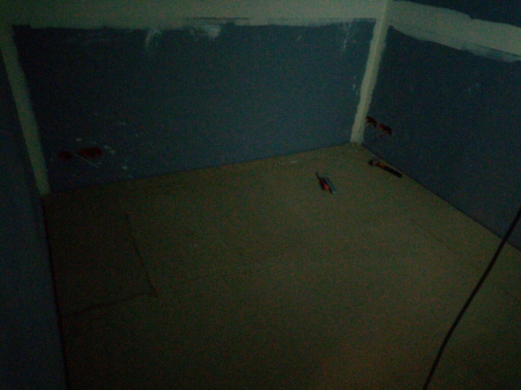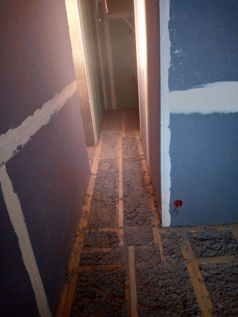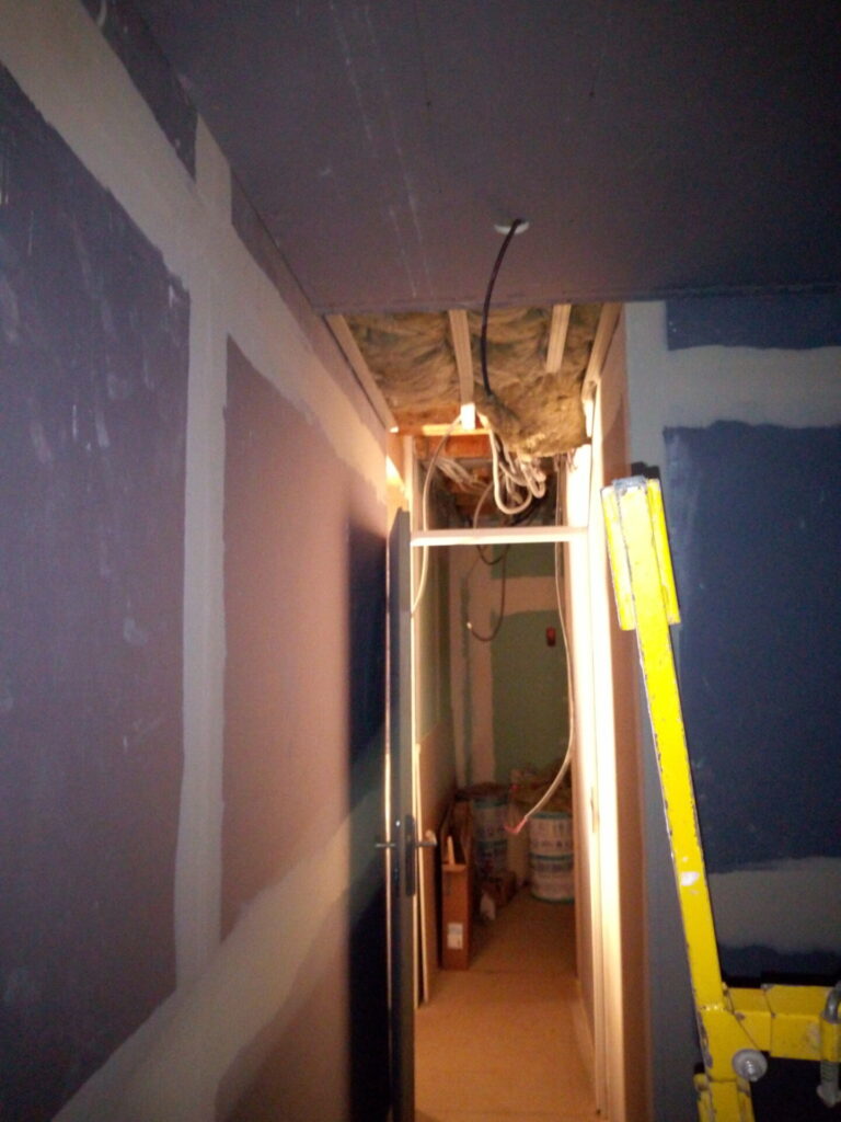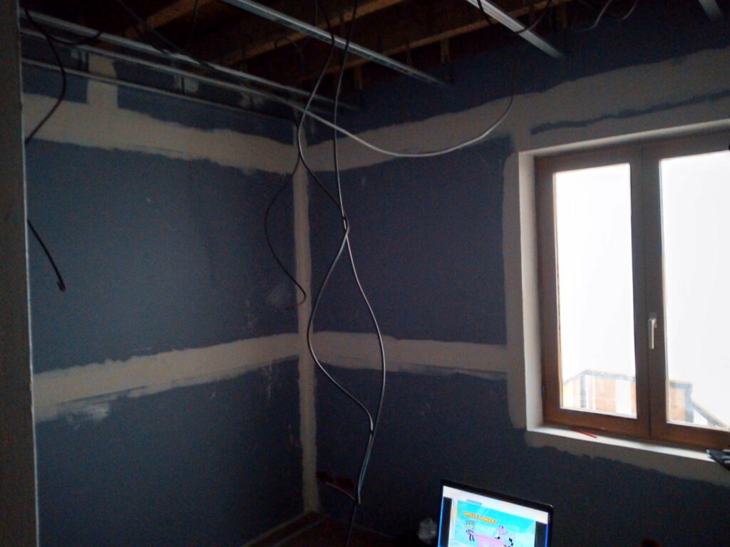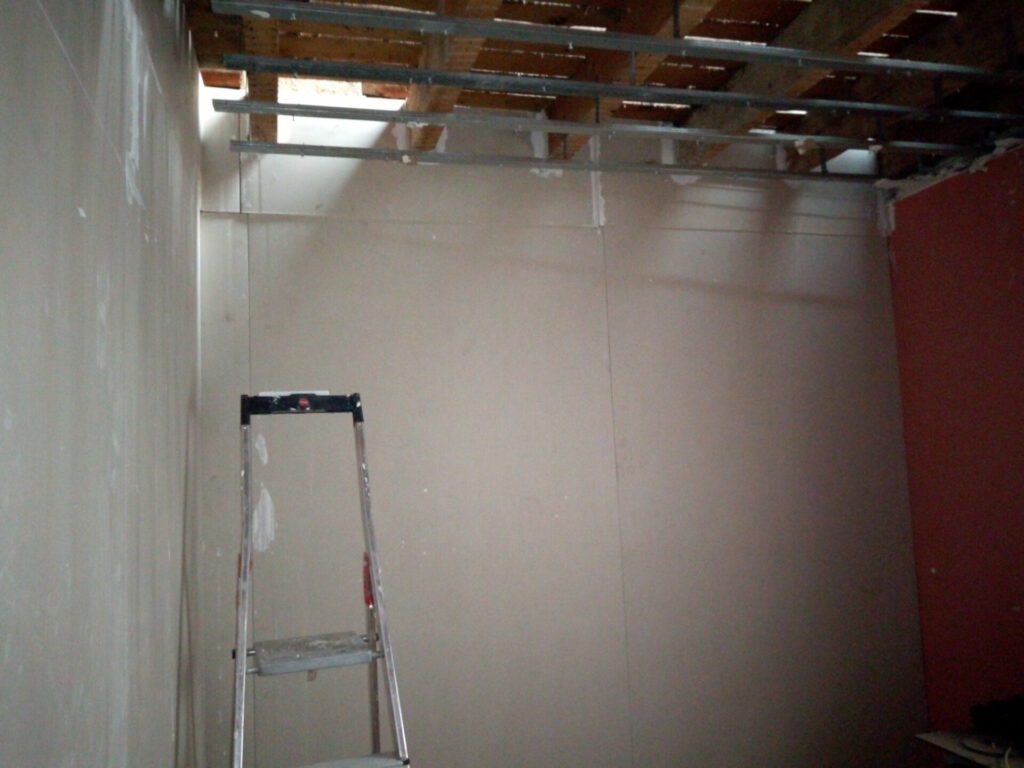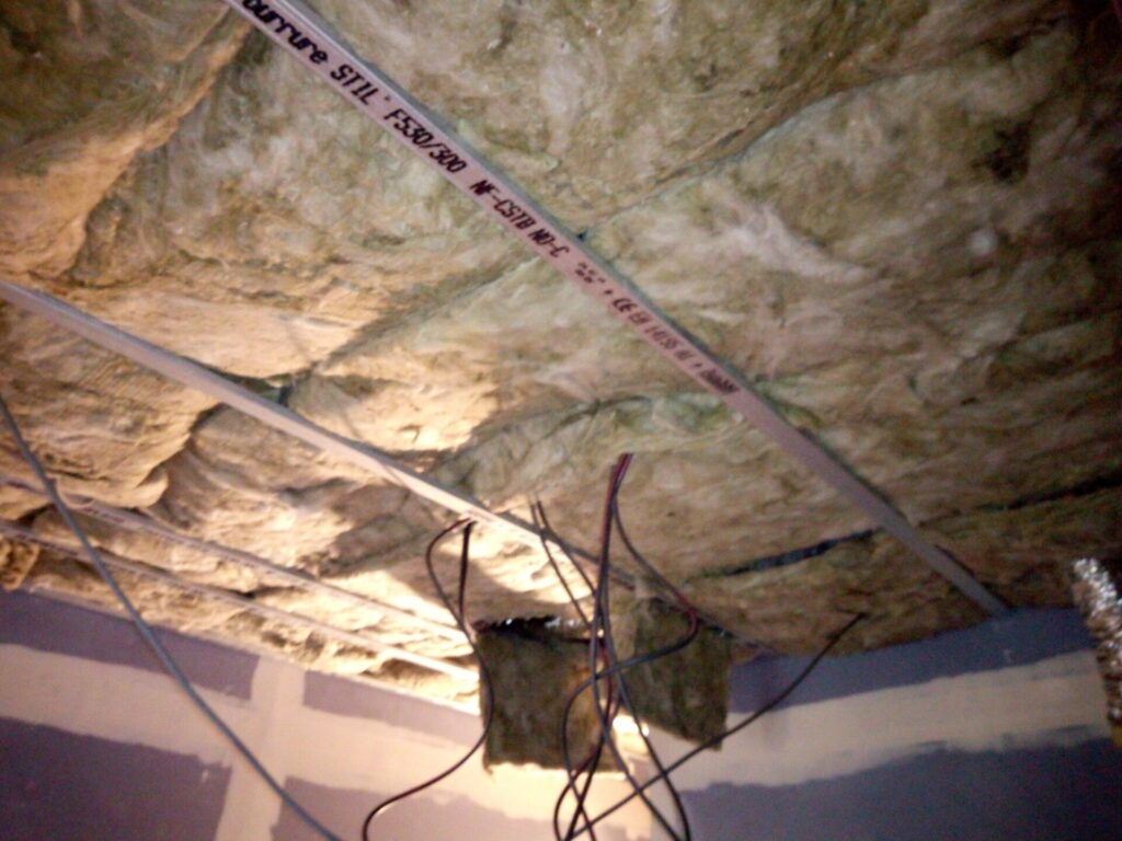 Le plafond est isolé et plaqué aussi en placo phonique puisqu’à l’avenir une chambre sera créée au dessus.