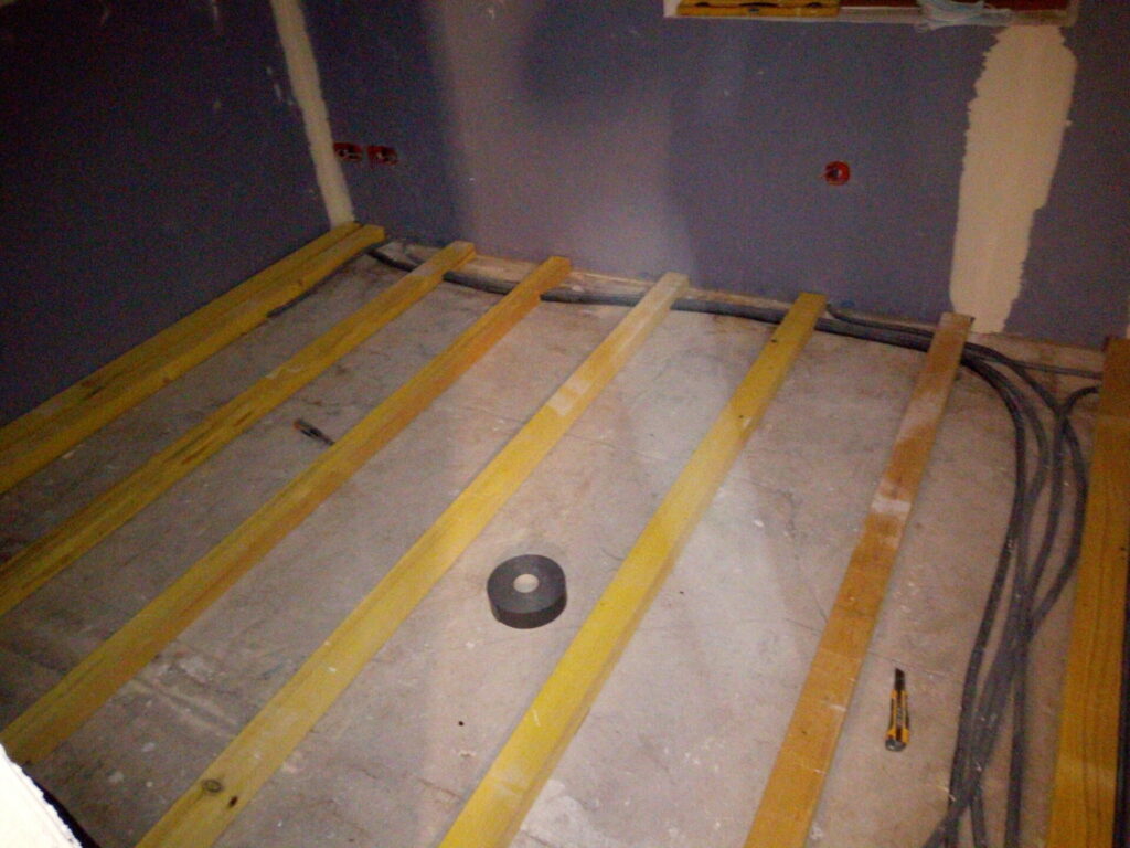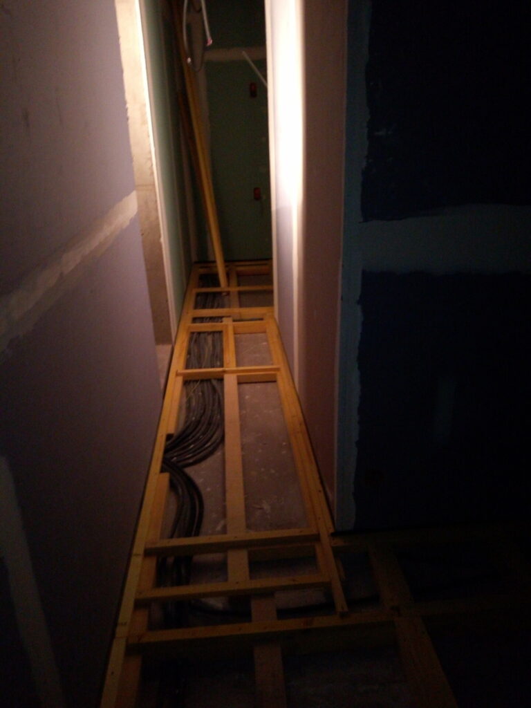 Au niveau du sol, un faux plancher désolidarisé de l’existant à du être créé pour rattraper la marche du couloir et servir d’espace technique pour le réseau électrique, tv et réseau informatique.