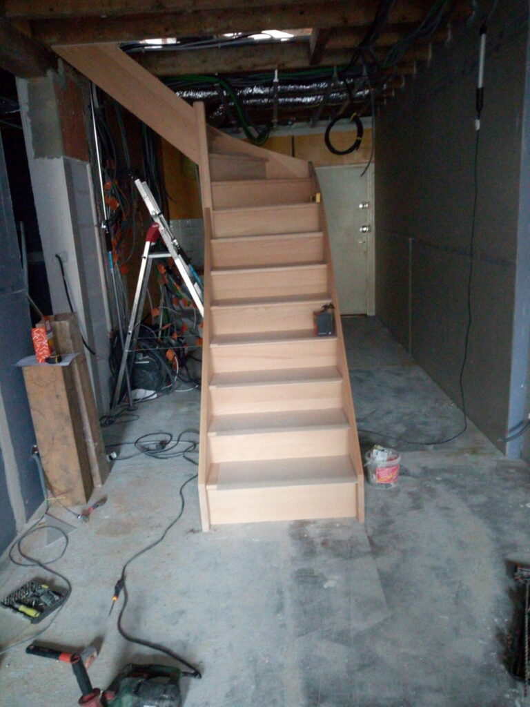 L’intérêt c’est que déjà ce n’est pas de la planchette de merde, c’est du hêtre et c’est du costaud. En plus de ca, en étant sur mesure l’escalier s’adapte parfaitement à mes exigences : il est très praticable et me laisse de bonnes largeurs de chaque coté pour l’accès à la cuisine et l’accès à la salle de bain et au bureau, bref je ne regrette pas même si évidemment ca a représenté un certain budget …