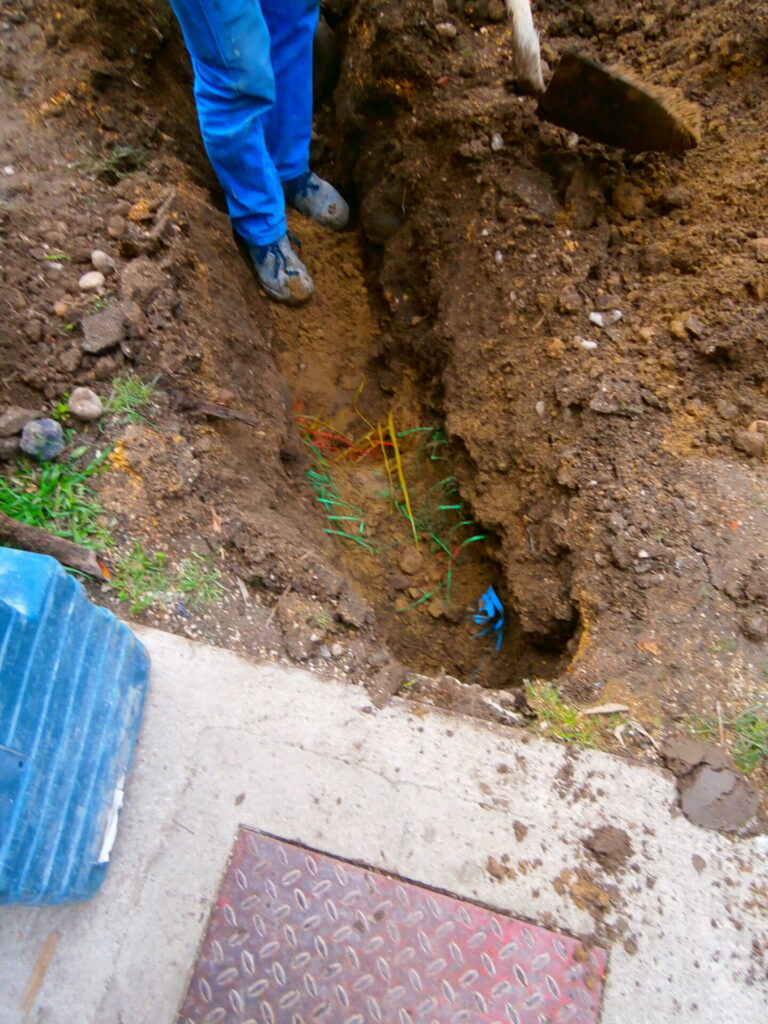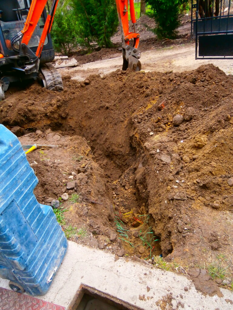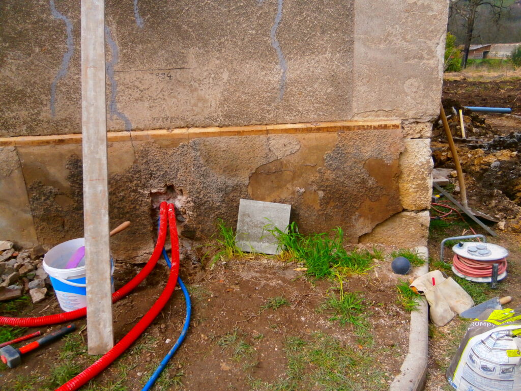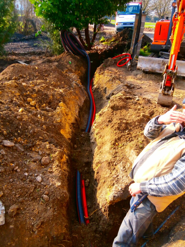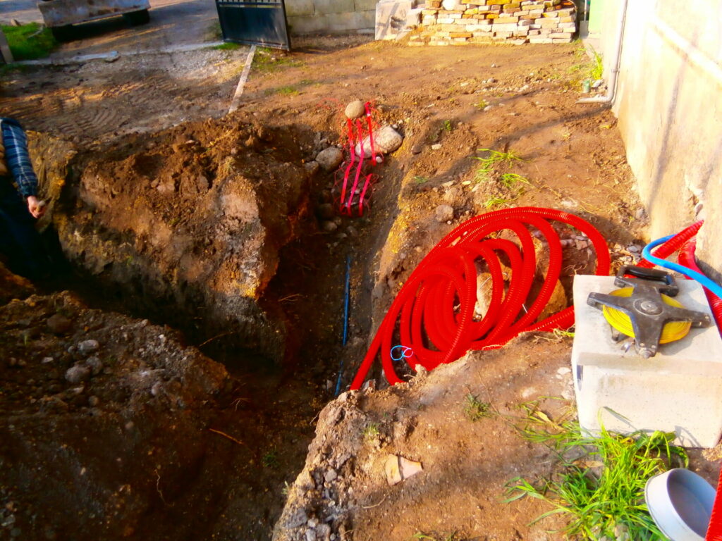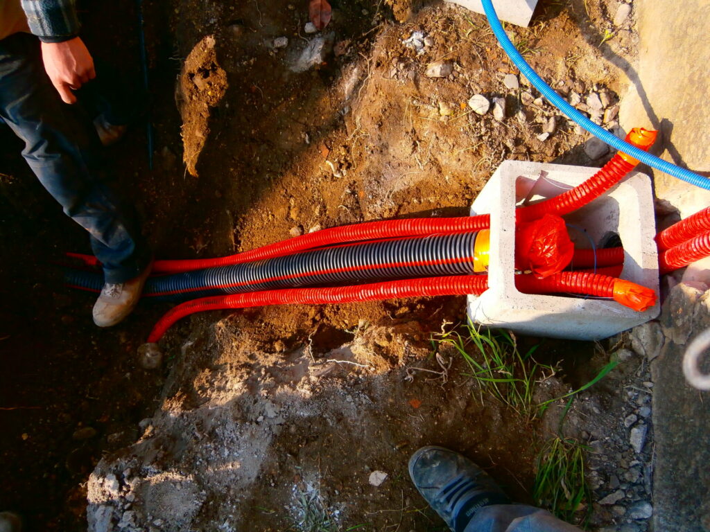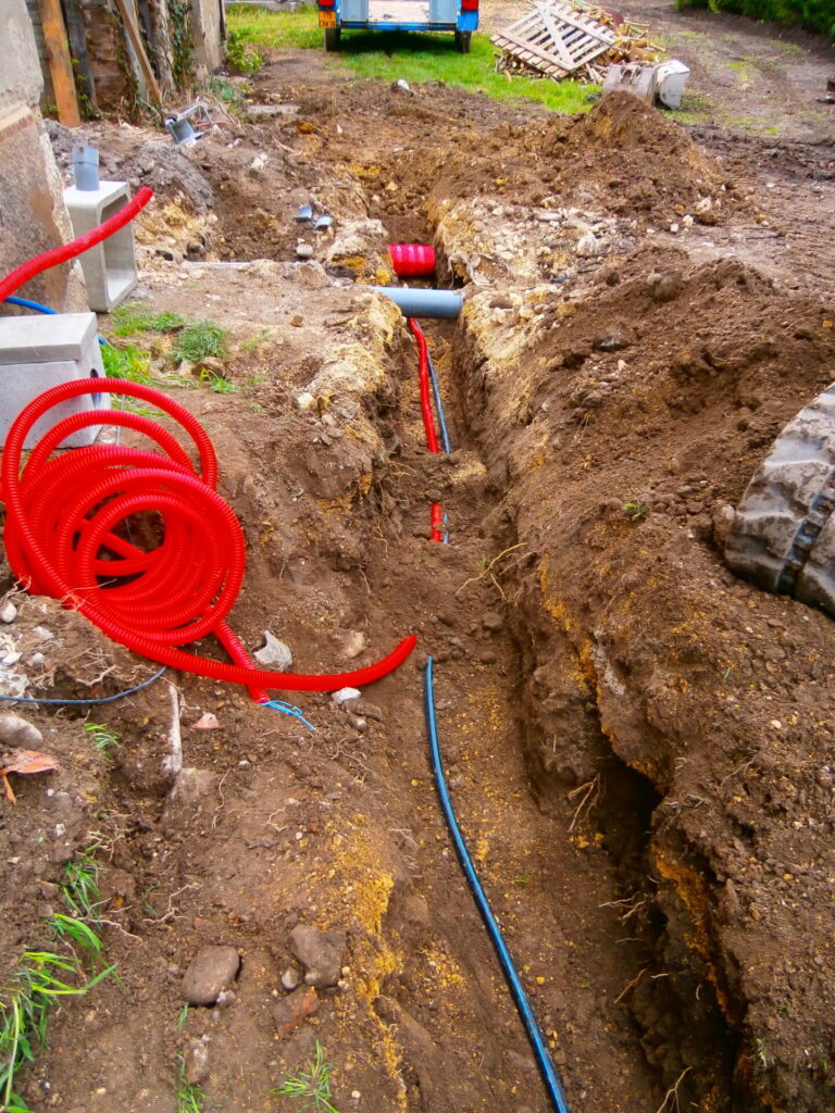 On en a donc profité pour tirer pas mal de trucs : une arrivée d’eau et des fourreaux pour pouvoir alimenter la cabane en eau et électricité, un fourreau pour l’arrivée électrique si un jour il devenait impératif de supprimer la ligne aérienne et enfin des fourreaux pour éventuellement alimenter un portail électrique par la suite.