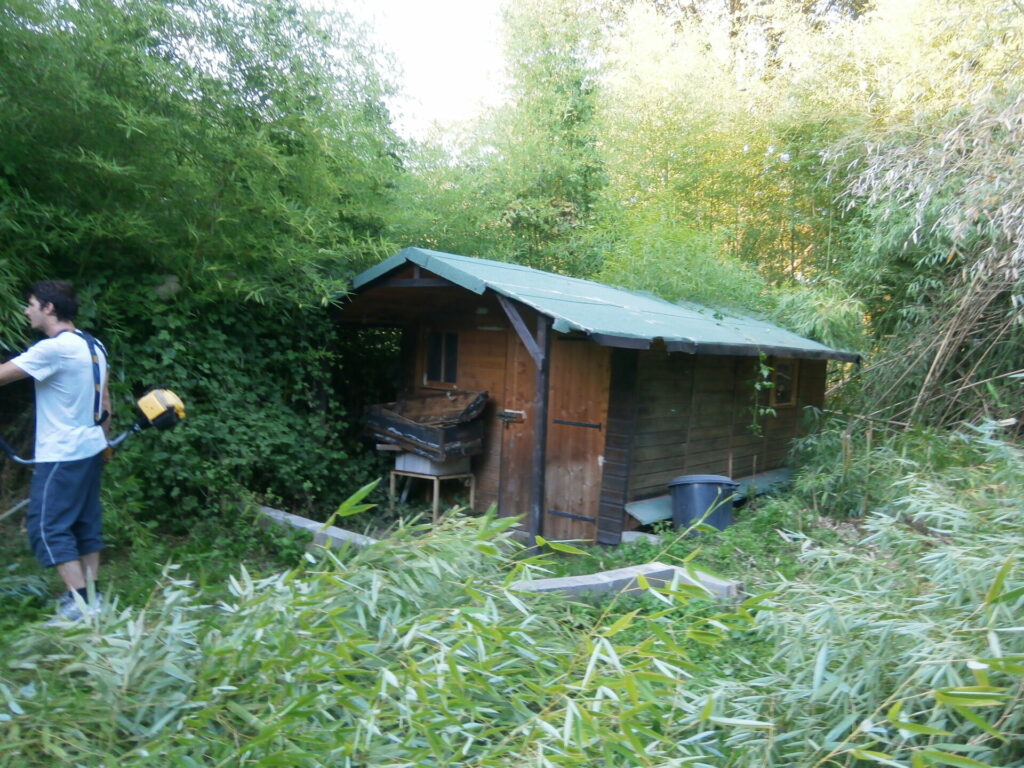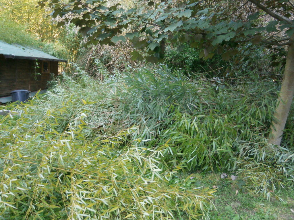 Pour autant ce n’était pas totalement terminé, il y a eu quelques repousse ça et la et surtout autour des cabanes car les rhizomes s’étaient aussi installés sous les dalles … Pour en venir à bout j’ai du employer une méthode tout sauf écologiques : je mettais du roundup dans des bouteilles en plastique et je courbais les repousses dans les bouteilles … Au bout de quelques jours les repousses mourraient et s’en fut terminé de l’épisode bambous …
