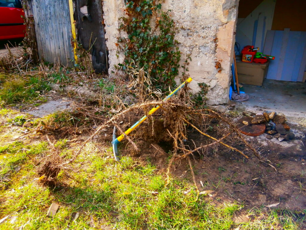 On a commencé à tout couper à ras pour ensuite retirer les souches à la pioche … Alors déjà c’est éreintant, vu que ces des rhizomes qui partent dans tous les sens, et en plus ca va très profond …