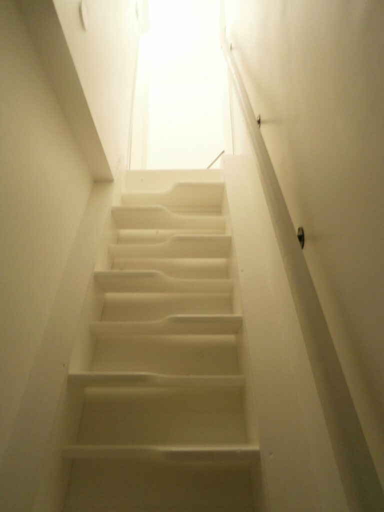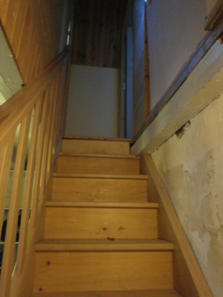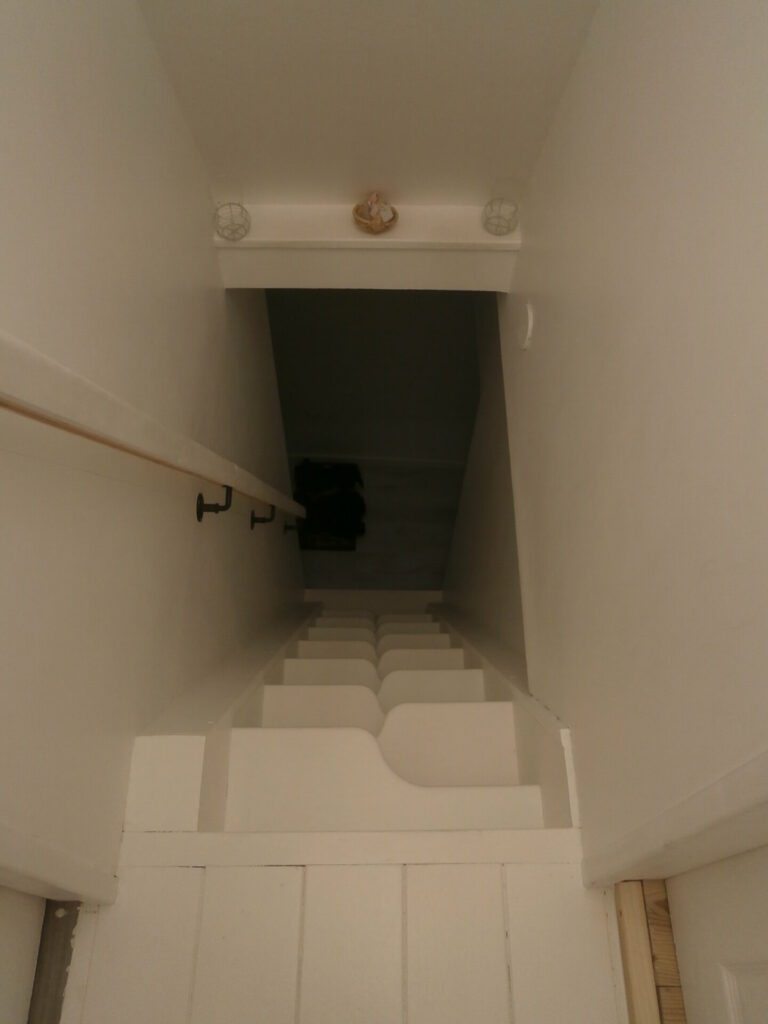 L’escalier original était très bien mais vraiment encombrant … On a donc décidé de le retirer, d’inverser le pallier du dernier étage et de le remplacer par un escalier droit à pas japonais (ou décalés) beaucoup plus compact.